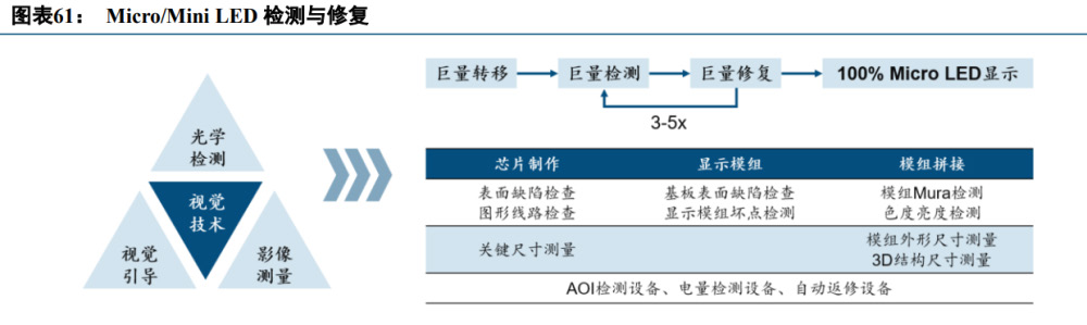 自動(dòng)返修技術(shù)成熟將大幅降低成本。返修設(shè)備的開(kāi)發(fā)是Mini LED新的難點(diǎn),設(shè)備廠商多方探索,方案逐步成熟。由于對(duì)微米尺寸且數(shù)量龐大的LED燈珠進(jìn)行有效檢測(cè)并修復(fù)壞點(diǎn)難度很大,目前設(shè)備廠商的返修功能包括自動(dòng)獲取不良坐標(biāo)和不良類(lèi)型、自動(dòng)剔除不良元件(超聲波或激光)和清理焊盤(pán)、自動(dòng)重置焊錫或銀膠、二次固晶和焊接等。隨著對(duì)成本影響較大的自動(dòng)返修技術(shù)成熟,Mini LED的成本也將大幅降低。