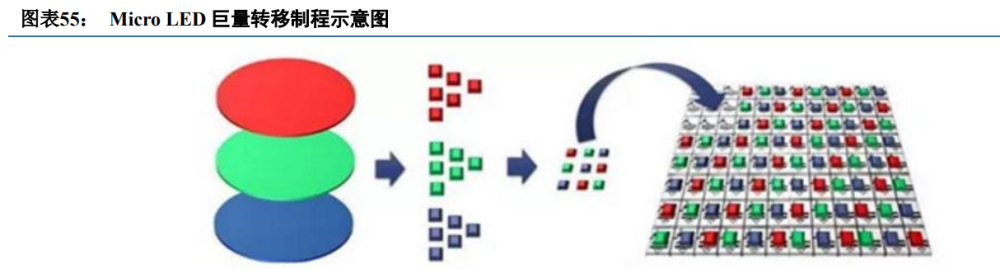 Micro LED目前面臨的最大難點(diǎn)是巨量轉(zhuǎn)移,目前技術(shù)尚未成熟。巨量轉(zhuǎn)移指將Micro LED芯片轉(zhuǎn)移到由電流驅(qū)動(dòng)的TFT基板上,并在微米級(jí)水平組裝成為二維周期陣列的過(guò)程。Micro LED轉(zhuǎn)移的像素顆粒數(shù)量極多(500PPI的5英寸手機(jī)屏幕需要800萬(wàn)個(gè)像素顆粒)、尺寸極小(要求微米級(jí)安裝精度),每個(gè)像素包括RGB三個(gè)小燈珠,轉(zhuǎn)移像素三倍的小燈珠的同時(shí)保證精度是非常困難的。