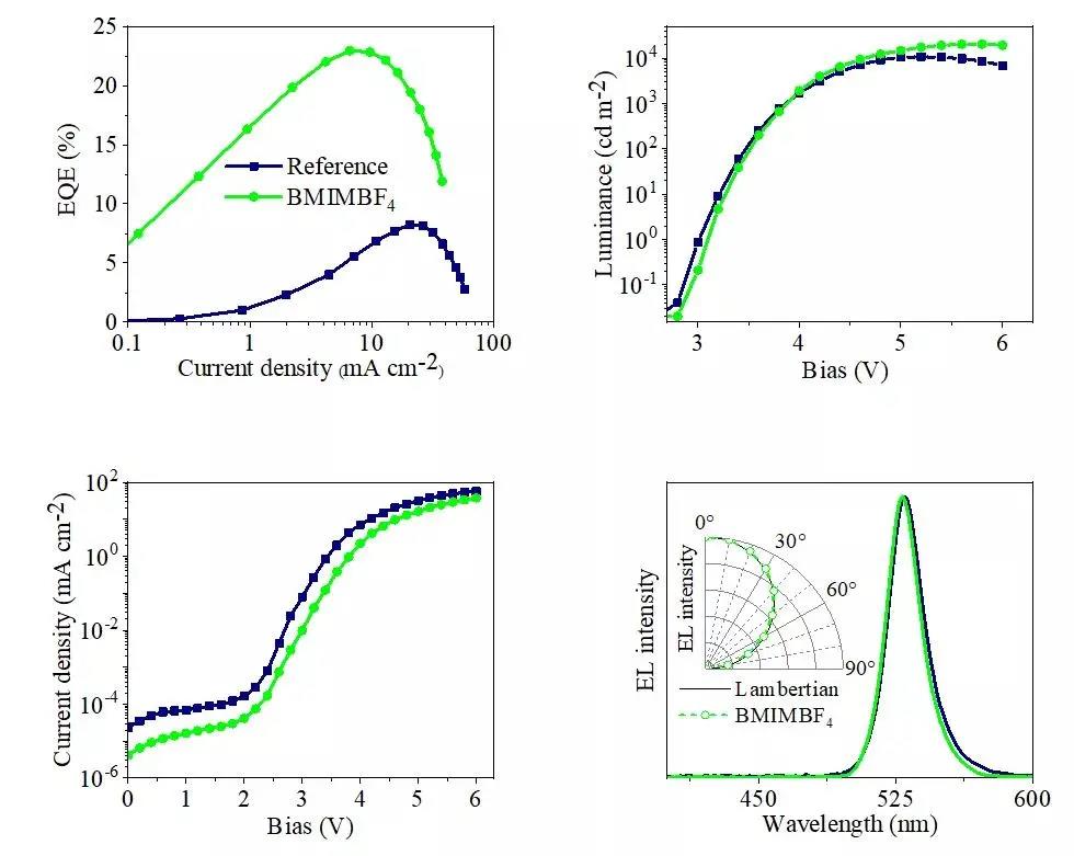 近日,電子科技大學光電科學與工程學院李世彬教授課題組在ACS Energy Letters (美國化學學會-能源快報)上發表了題為“Targeted Distribution of Passivator for Polycrystalline Perovskite Light-Emitting Diodes with High Efficiency”的高效率鈣鈦礦LED最新研究成果。光電科學與工程學院2018級博士研究生彭雪峰和西南大學物理科學與技術學院楊曉暉為共同第一作者,光電科學與工程學院李世彬和陳力教授為共同通訊作者,電子科技大學光電科學與工程學院為第一作者單位。該工作采用離子液體(BMIMBF4)修復多晶鈣鈦礦薄膜,通過路易斯酸堿的鈍化作用和BMIM+ 離子鈍化劑的靶向分布,實現了充分缺陷鈍化進而大幅提高器件的發光效率和工作穩定性。基于本研究組已報道的能夠高效鈍化多晶鈣鈦礦薄膜下表面的聚苯乙烯磺酸鈉改性PEDOT:PSS空穴傳輸層,制備了離子液體(BMIMBF4)靶向分布引起對PEA(FAPbBr3)4Br鈣鈦礦薄膜充分缺陷鈍化的高效率發光二極管,其外量子效率為22.9%,電流效率為98cd A-1 ,發光波長為529nm。