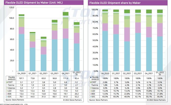 市場研究機構(gòu)Stone Partners 3月23日表示,京東方今年一季度柔性O(shè)LED出貨量預計將達到2020萬片,較2021年同期的 1160 萬片增長 74%,自 2021 年第一季度以來的季度。