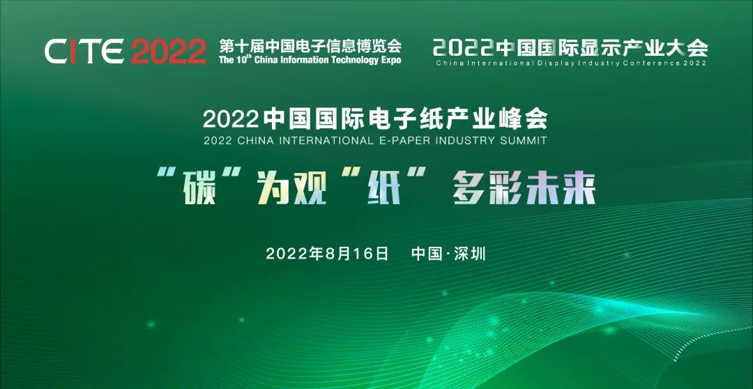 作為第十屆中國電子信息博覽會(CITE2022)同期論壇活動——2022中國國際顯示產業大會的系列活動之一,以“‘碳’為觀‘紙’ 多彩未來”為主題的2022中國國際電子紙產業峰會將于8月16日在深圳舉行。大會已邀請到京東方、華為、E Ink元太科技、廣州奧翼、Bigme大我集團、萊寶高科、全志科技、鑫柔科技、誠億智能裝備等名企,以及華南師范大學、洛圖科技等專業院校、研究咨詢機構,從顯示技術、行業發展、應用場景等方面做主題分享,共同為電子紙產業健康發展集思廣益。