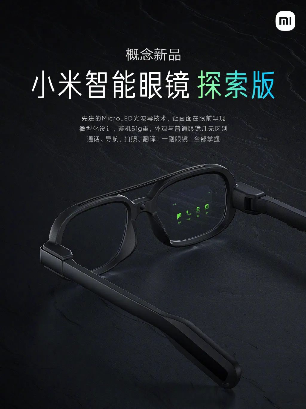 小米曾在 2021 年公布了小米智能眼鏡探索版,采用 MicroLED 光波導技術,將 MicroLED 微型顯示屏隱藏于鏡架之中,通過先進的光波導鏡片,讓光線實現空間轉移,畫面躍然眼前,讓智能眼鏡真正實現微型化,整機 51g 重,支持通話、顯示、導航、拍照、翻譯。