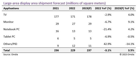 Omdia報告顯示,全球經濟衰退,加上俄烏戰爭沖擊,導致大尺寸顯示面板需求自2022年初開始凍結,2022年大尺寸顯示面板出貨量年減8.2%,出貨面積年減3.1%。