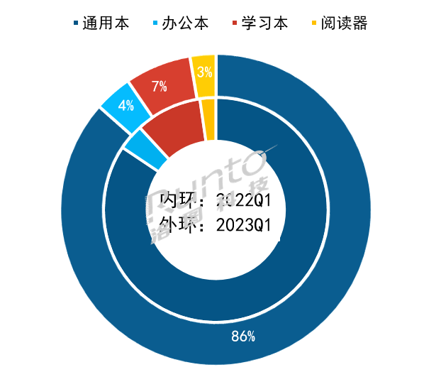 根據洛圖科技(RUNTO)線上監測數據顯示,2023年第一季度,通用本仍為市場主流,銷量占比為86.5%,較去年同期增加了2.1個百分點。學習本占比為6.8%,較去年同期減少了2.8個百分點;閱讀器(注:Kindle不屬于智能平板)和辦公本占比分別達到4.0%和2.7%。