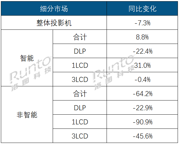投影機(jī)出貨和智能投影零售的趨勢(shì)走向不同的原因,一方面在于出貨(Sell in)和零售(Sell out)的口徑差異;更核心的原因在于,中國(guó)市場(chǎng)的非智能投影正在快速淘汰,同比下滑64.2%,其撤退速度極大的拉低了整體市場(chǎng)大盤。