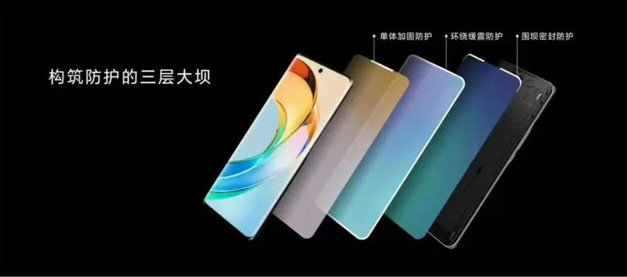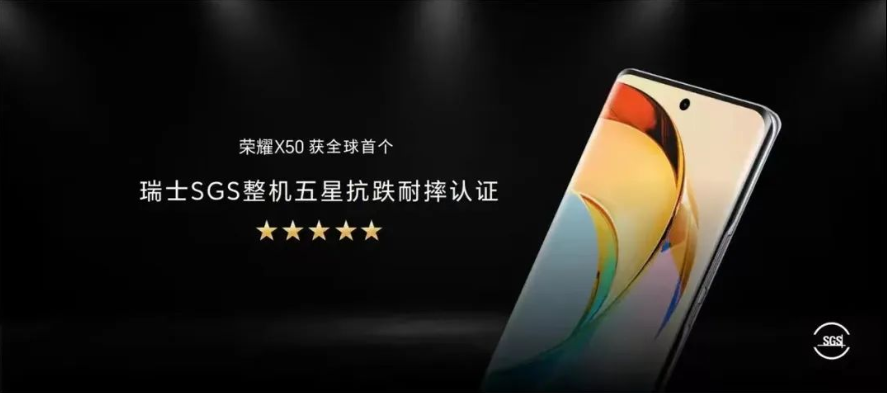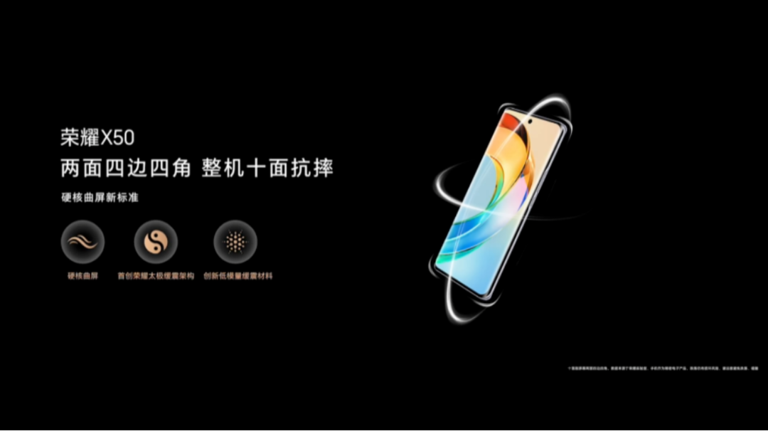 官方稱榮耀 X50 是行業耐摔的曲面屏手機天花板,全球首個獲得瑞士 SGS 整機五星抗跌耐摔認證,不僅屏幕抗摔,整機十面同樣抗摔。全新的“榮耀太極緩震架構”(單體加固防護、環繞緩震防護、圍壩密封防護),讓硬跌落實現軟著陸。通過工藝與材料的雙重創新,實現兩面四邊四角,十面無死角的抗摔。