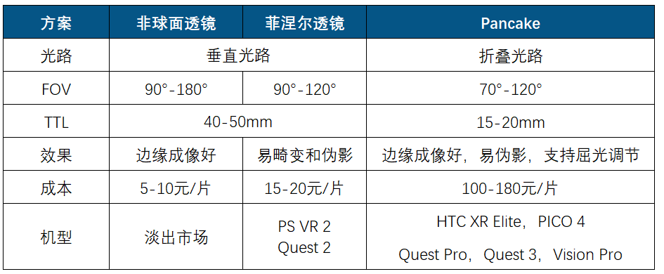 VR光學方案沿著“非球面透鏡-菲涅爾透鏡-Pancake”的路徑發展。此前菲涅爾透鏡因低成本和可控的成像質量,成為VR產品的主流方案。隨著消費者對VR的重量體積、成像質量、佩戴體驗提出更高的要求,折疊光路原理的Pancake方案憑借輕薄優勢和優秀的成像質量,以及趨于成熟的量產工藝,成為VR光學技術的進化方向。