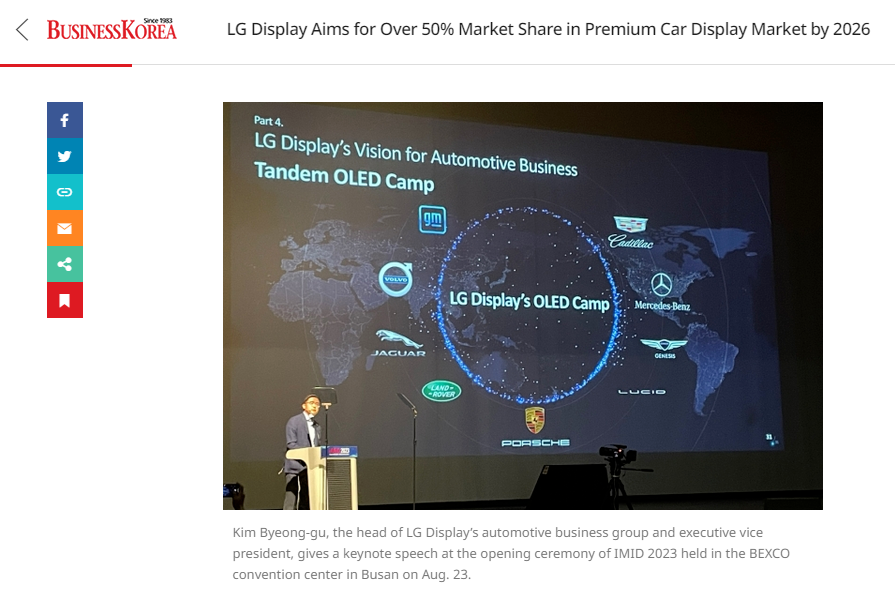 據(jù)韓媒 BusinessKorea報道,8月23日,LG顯示汽車業(yè)務(wù)集團(tuán)負(fù)責(zé)人兼執(zhí)行副總裁Kim Byung-gu在參加活動時發(fā)表了主題演講。該負(fù)責(zé)人指出,隨著汽車發(fā)展成為“有輪子的智能手機(jī)”,車載屏幕將發(fā)揮關(guān)鍵作用。預(yù)計2030年,車載屏幕市場將實現(xiàn)約10%的年均增長率。