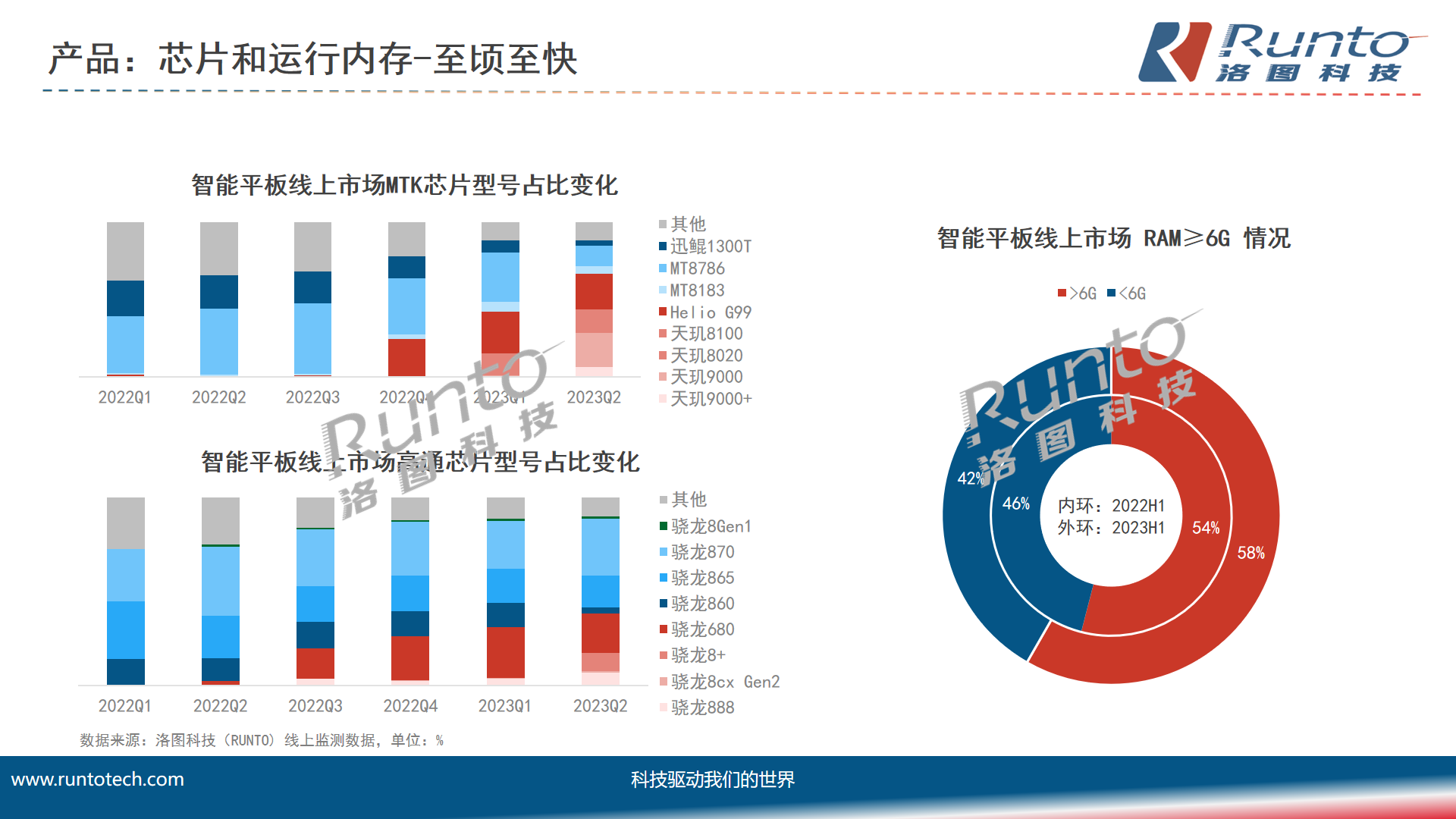 今年上半年,智能平板線上監測市場中,大范圍應用了芯片廠商高通和MTK的新型號芯片;運行內存大于6G的產品占比為58%,較去年同期提升了4個百分點。