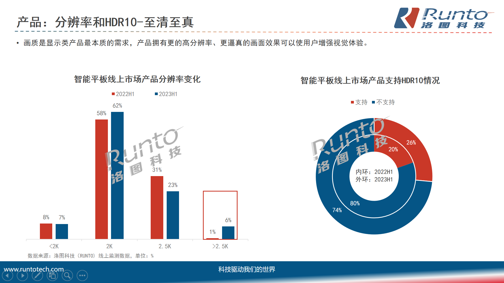 今年上半年,智能平板線上監測市場中,分辨率>2.5K的產品占比較去年同期提升了5個百分點,達到6%;顯示畫面支持HDR10的產品較去年同期增加了6個百分點,達到26%。