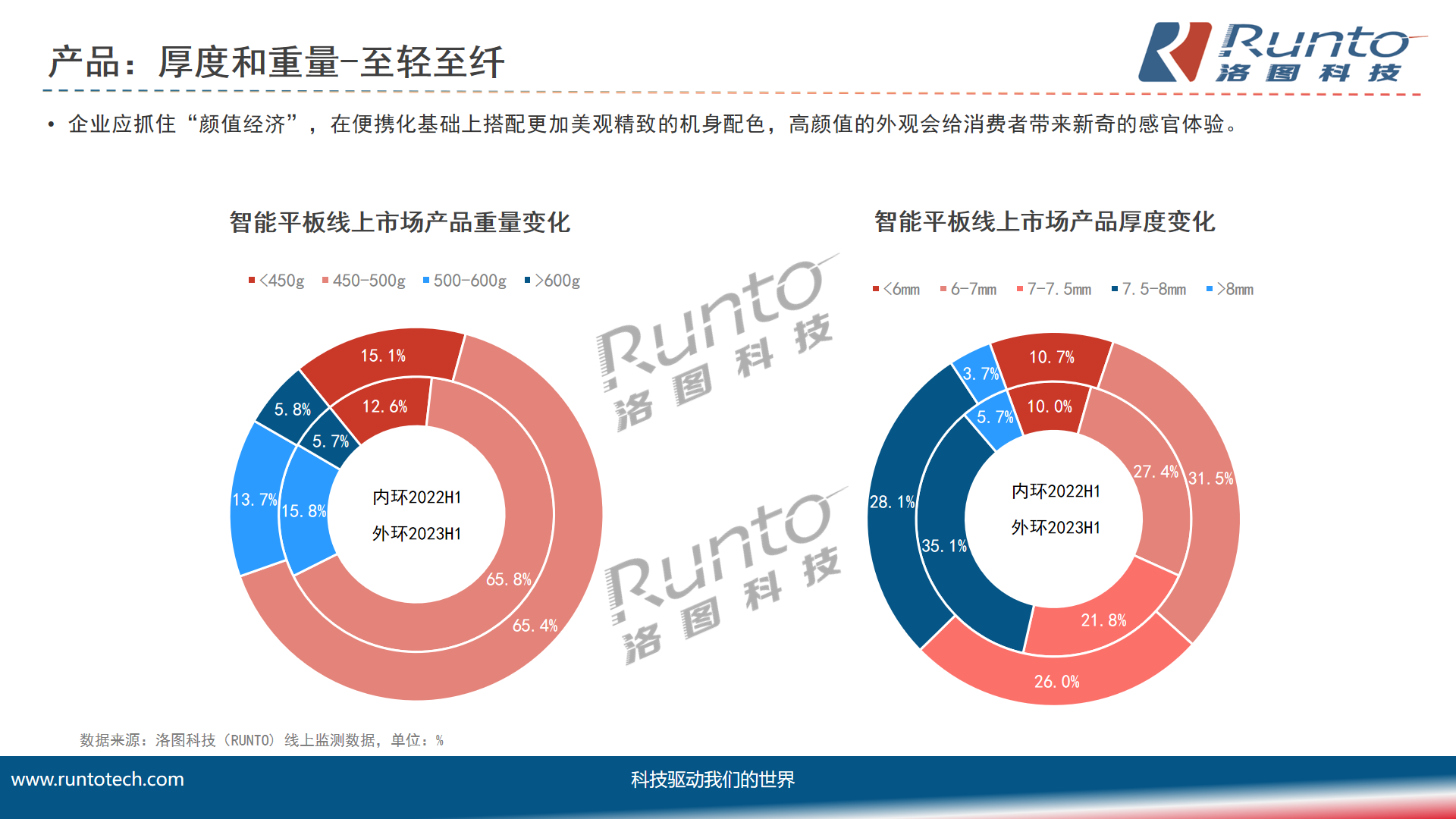 根據洛圖科技(RUNTO)線上監測數據顯示,今年上半年智能平板線上市場中,產品重量小于450g的占比為15.1%,較去年同期增長了2.5個百分點;產品厚度小于7.5mm的占比為68.2%,較去年同期增長了9.1個百分點。