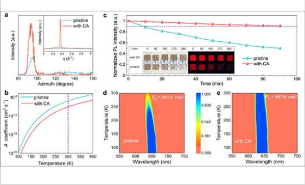 與傳統的單一官能團試劑不同,CA 除了具有抗氧化作用之外,還具有其它諸多效力。首先,CA 互變異構混合物形成的二聚體和三聚體超結構可以鈍化薄膜表面缺陷;其次,CA 的多官能團特性使得其在形成二聚體 / 三聚體之后,仍然有多余的官能團可以與鈣鈦礦配位,起到穩定晶界的作用,從而顯著提高 Sn 基鈣鈦礦的晶體穩定性;最后,CA 互變異構混合物配位能誘導 Sn 周圍電子局域,這有助于獲得更穩定、有序地鈣鈦礦晶格,從而弱化安德森局域化的不利影響,使得優化后的 TEA2SnI4 薄膜的非輻射復合系數降低兩個數量級,激子束縛能提高兩倍。