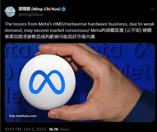 郭明錤表示,Meta 公司的頭顯(元宇宙硬件)出貨量持續顯著衰退,而縮減頭顯(元宇宙)業務對改善 Meta 公司的虧損幫助也相對有限。