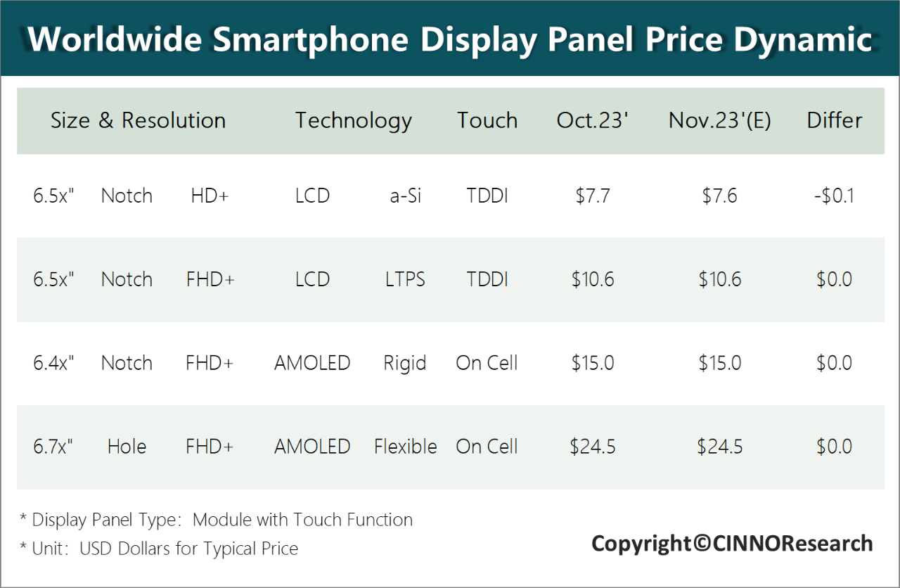 CINNO Research預測,11月和12月LTPS/柔性AMOLED整體價格將有機會小幅上漲,a-Si低價產品亦將小幅上漲。