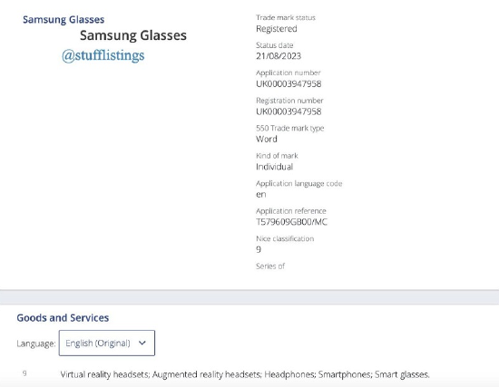 商標(biāo)信息顯示,“Samsung Glasses”商標(biāo)于 2021 年 8 月 21 日提交,申請(qǐng)?zhí)枮?UK00003947958,尼斯分類第 9 類,商品和服務(wù)指出“虛擬現(xiàn)實(shí)頭顯;增強(qiáng)現(xiàn)實(shí)頭顯;智能眼鏡”。