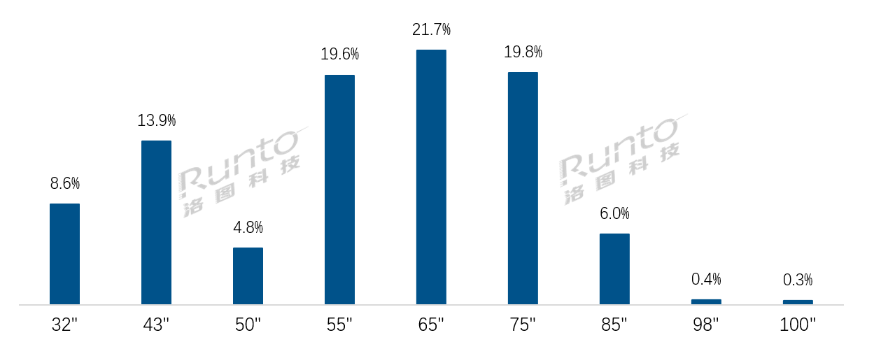 整體來看,65寸的銷量占比達到21.7%,超越占比19.6%的55英寸,成為第一大尺寸。而75寸緊隨其后,銷量占比達19.8%,較2022年大幅提升7.3個百分點。