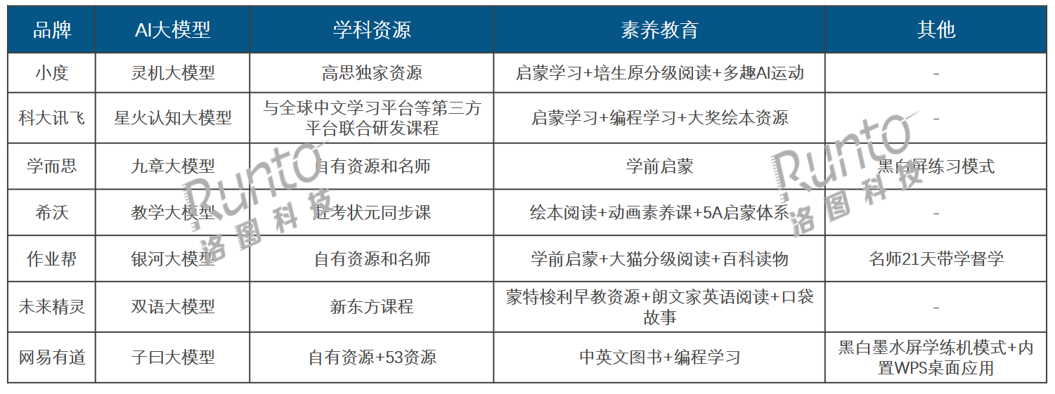 產品方面,大模型、高分辨率、護眼功能等技術不斷深化;大電池、支架、手寫筆、鍵盤等硬件配置越來越完善;內容資源逐漸擴展至素質教育、興趣培養等領域,為行業營造更多元化的發展機遇。