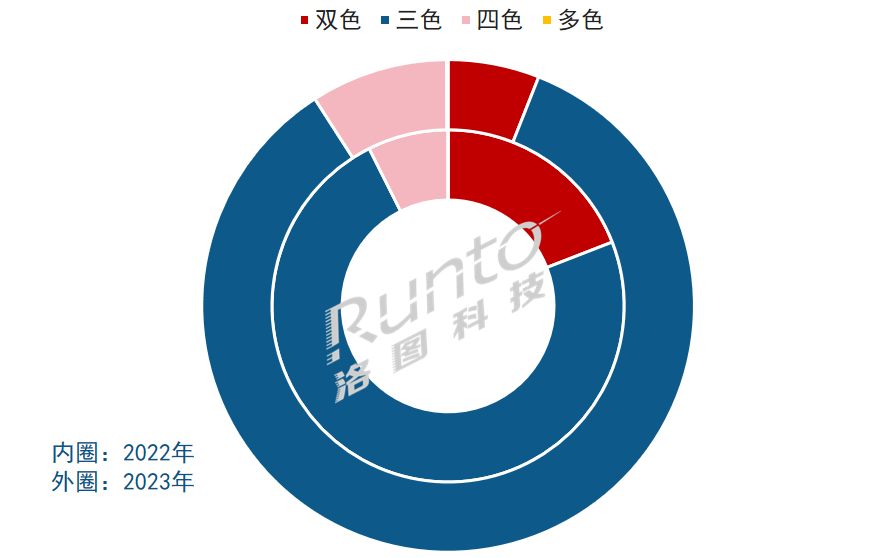 標簽顏色方面,多色標簽成為主流。2023年的顏色結構與2022年對比,可以看出,電子紙模組的顏色向三色集中,三色中以黑白紅、黑白黃為代表,占比升至84.9%,較2022年提升11.4個百分點。雙色模組由于顯示效果、內容及適應溫度等方面不具備優勢,與三色的價格差距也在縮小,因此占比已經降至6%。