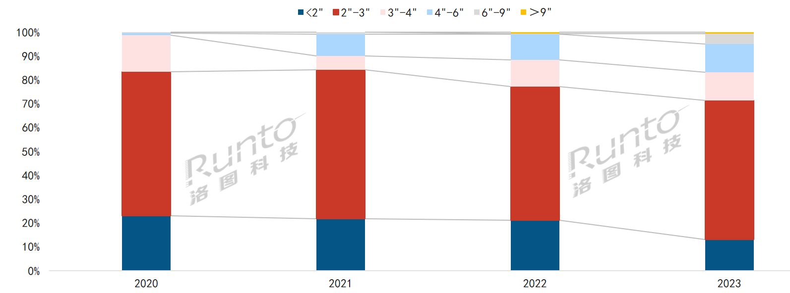 標簽尺寸方面,3寸以上產品增幅明顯。整體來看,電子紙標簽仍然以小尺寸為主流,2-3寸的尺寸區間的市場份額達到了58.3%,該尺寸段是匹配貨架間隔最合適的尺寸段,未來仍將持續保持這個占比水準。3寸以上標簽的應用也在加快,市場份額逐年提升,2023年達到了28.8%,較2022年提升了5.8個百分點。