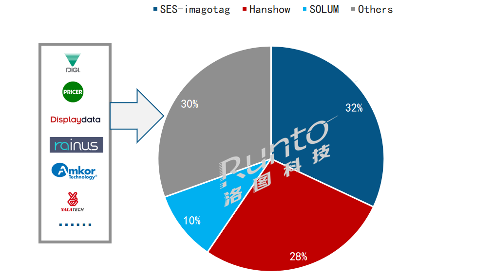 標簽品牌方面,競爭格局相對穩定,各大品牌的市場份額隨著各自項目的落地略有調整,但幅度變化并不是很大。根據洛圖科技(RUNTO)數據顯示,市場第一大品牌為法國的SES-imagotag,在全年的市場占有率為32%。SES在零售行業深耕時間較長,借助其成熟的經營合作模式、渠道鏈條及品牌效應,能夠在零售領域進行前瞻性、靈活性的布局,全年在英國、意大利、美國、法國、荷蘭等國家的商超連鎖店、家裝零售店、食品零售店、服裝零售店等上千家門店完成布局,有效支撐了其出貨量的增長。進入第四季度,SES多個項目實現了落地,在法國家裝零售商Lapeyre的132多家商店、意大利食品商Unicoop Firenze的110家商店進行了數字化升級,在荷蘭食品批發商HANOS部署了60萬個電子紙標簽。洛圖科技(RUTO)預測,到2024年,隨著沃爾瑪項目的落地執行,美國將成為對SES的出貨量貢獻最大的市場區域之一。