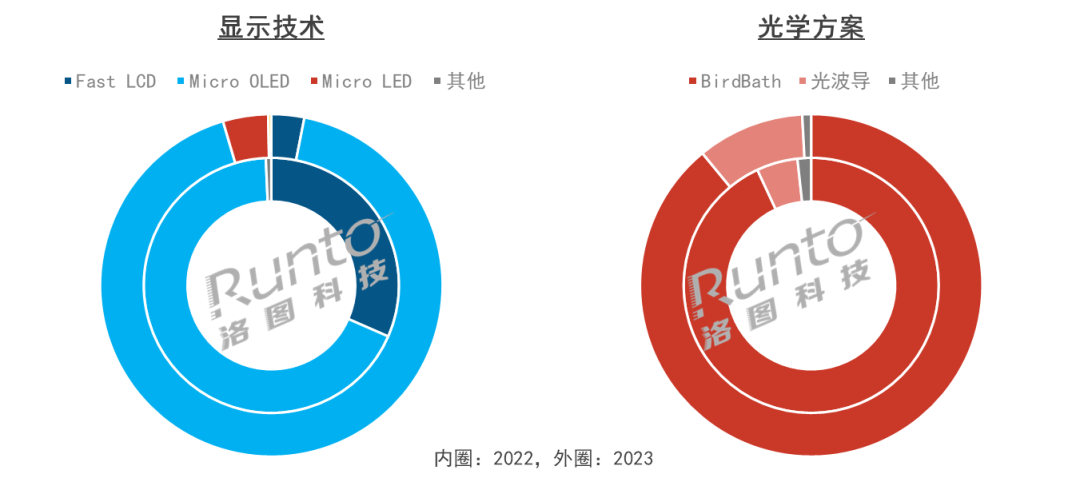 AR市場中,F(xiàn)ast LCD逐漸式微,線上市場份額已不足5%。Micro OLED成為了主要的顯示技術,根據(jù)洛圖科技(RUNTO)線上監(jiān)測數(shù)據(jù)顯示,2023年,Micro OLED在AR線上市場的占比達到92.3%,較上一年上漲24.6個百分點。