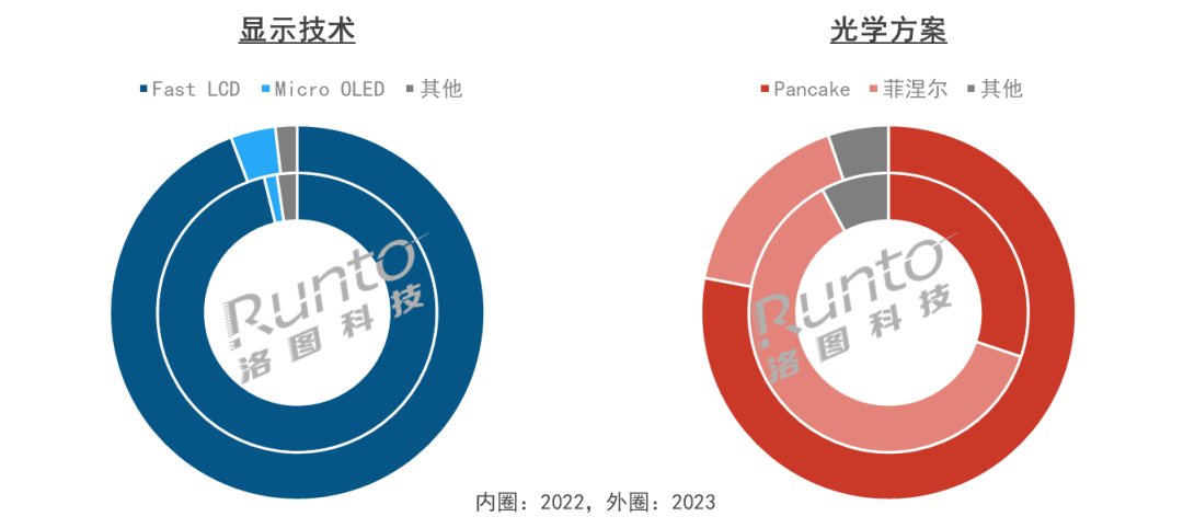 VR產(chǎn)品的光學方案完成了從菲涅爾透鏡到Pancake的轉變。此前菲涅爾透鏡因低成本和可控的成像質量,在市場占據(jù)主導;隨著Pancake方案量產(chǎn)工藝的成熟,加上其輕薄的設計和優(yōu)秀的成像質量,成為市場主流。2023年,Pancake光學方案在VR線上市場的市場份額達到78.0%,較2022年大漲47.9個百分點;菲涅爾方案市占下降至16.8%。