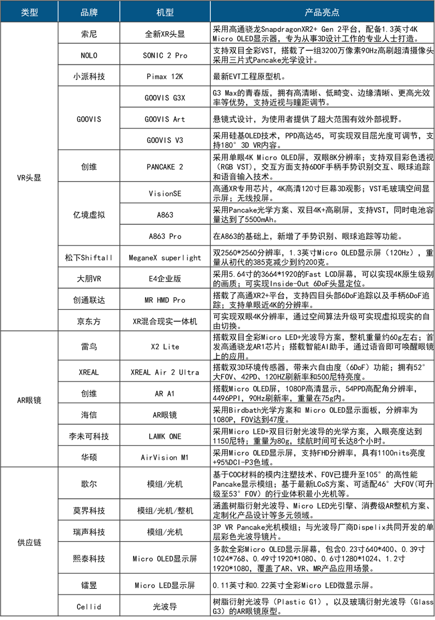 供應鏈方面,高通發(fā)布了最新的XR芯片平臺驍龍XR2+ Gen 2;Pancake和光波導是光學方案的重點方向;顯示技術方面,Micro OLED、Micro LED、LCOS等方案百花齊放。