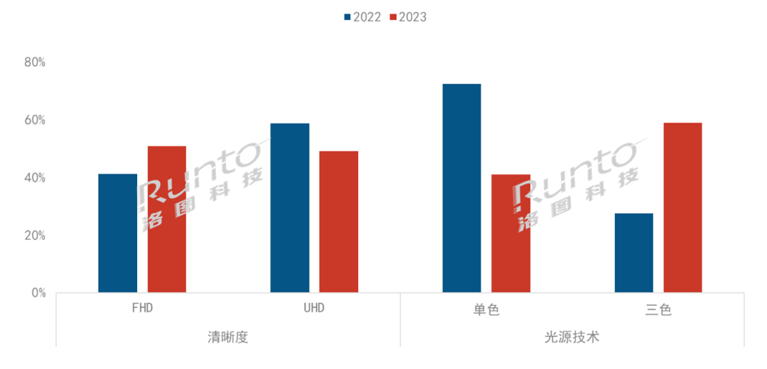 分辨率方面,F(xiàn)HD產(chǎn)品在家用激光投影市場的份額達(dá)到51%,同比增長10個百分點;UHD市場份額下降10個百分點,達(dá)到49%。