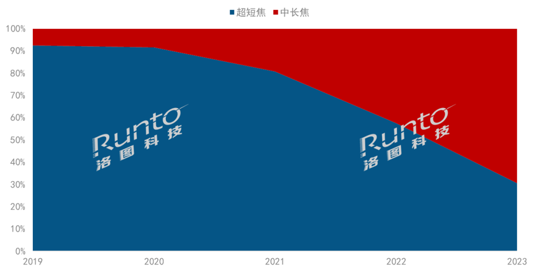 從鏡頭技術(shù)看,中長焦和超短焦在2023年首次出現(xiàn)反轉(zhuǎn)。根據(jù)洛圖科技(RUNTO)數(shù)據(jù)顯示,2023年,中長焦激光投影全年出貨量為41萬臺,同比增長121%;其與超短焦技術(shù)的出貨量比例從2022年的42:58變?yōu)?023年的69:31。