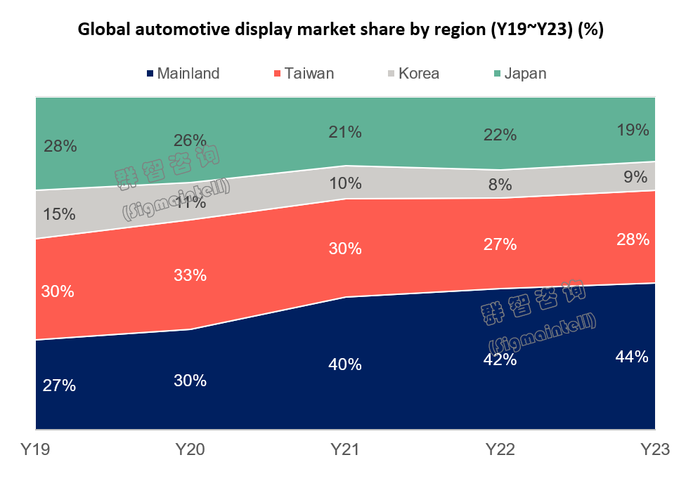 2023年,一方面隨著中國大陸地區在汽車銷量方面突破3000萬輛大關,刷新歷史紀錄,中國大陸汽車市場展現出前所未有的活力,自主品牌的持續發力和技術創新,特別是在智能化及新能源領域的顯著優勢,有力推動了國內產業鏈的蓬勃發展。同時,得益于完整的產業鏈布局、以及龐大的內需支撐,中國在新能源汽車領域不僅在國內市場獨占鰲頭,更在全球市場上占據了主導地位,為整個產業鏈的升級與發展贏得了寶貴的先發優勢。另一方面,車載顯示作為汽車智能化的核心載體,市場需求和技術不斷提升。中國面板廠商借助其在全球顯示產業中的領軍位置,精準把握市場趨勢,積極投入研發創新,成功將自身優勢延伸至車載顯示細分領域。群智咨詢(Sigmaintell)發布的最新統計數據顯示,2023年大陸地區面板廠在全球車載顯示市場的出貨份額的44%,充分彰顯了大陸地區面板廠在車載顯示行業的強大競爭力與領先地位。