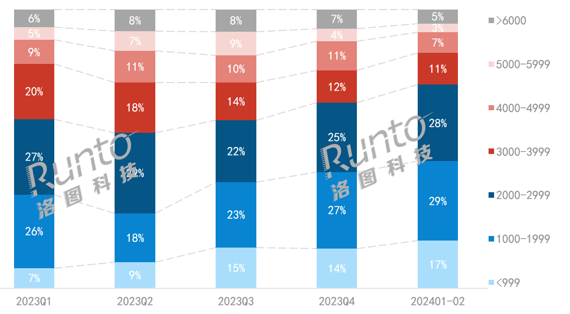 根據(jù)洛圖科技(RUNTO)線上監(jiān)測數(shù)據(jù)顯示,2024年1-2月,3000元以下中低端價位段占比已升至73.1%,同比增長了11.4個百分點。特別顯著的,低于1000元的產(chǎn)品份額從2023年初的7%升至目前的17%。