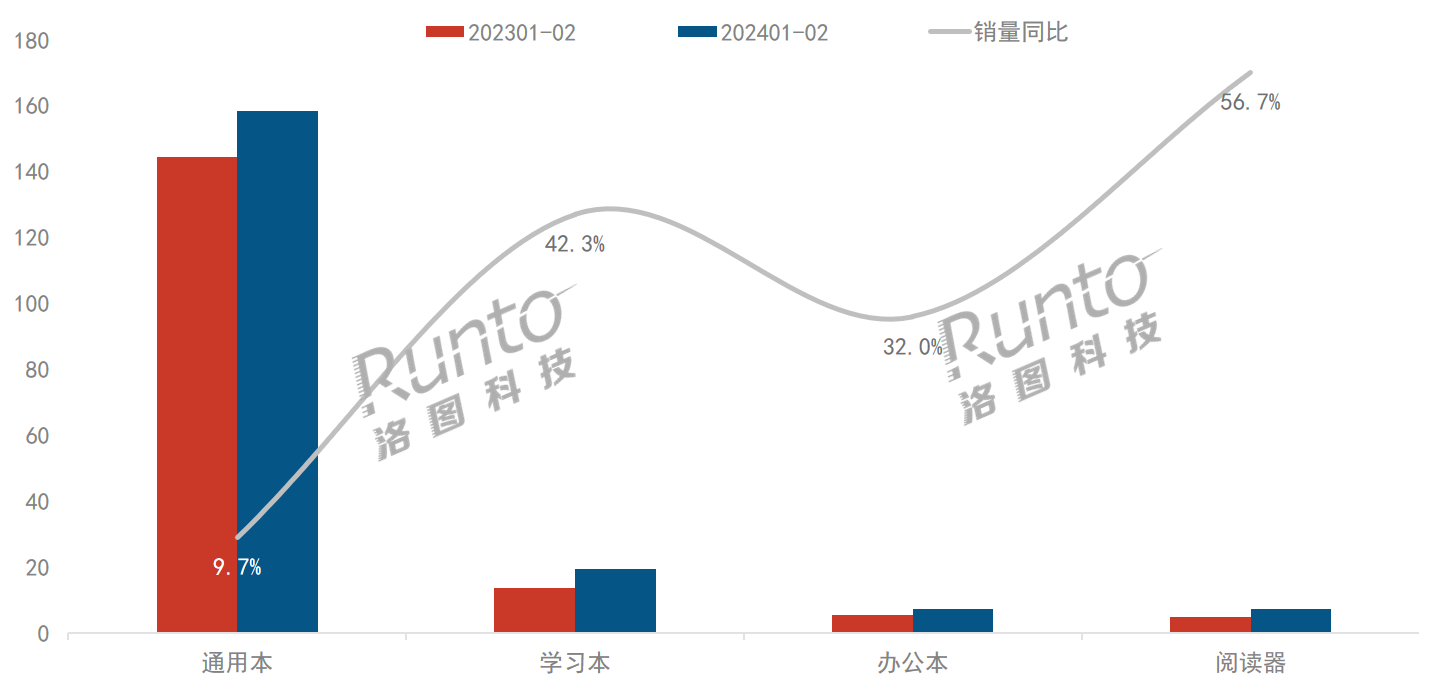 根據(jù)洛圖科技(RUNTO)線上監(jiān)測數(shù)據(jù)顯示,2024年1-2月,通用型平板占比82.3%,銷量同比增長9.7%。