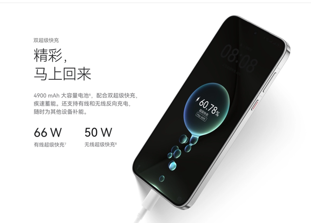 此外,該機擁有 4900mAh 電池,支持 66W 有線快充、50W 無線快充、7.5W 無線反向充電,搭載 Type-C 接口(USB 3.1 GEN1)。