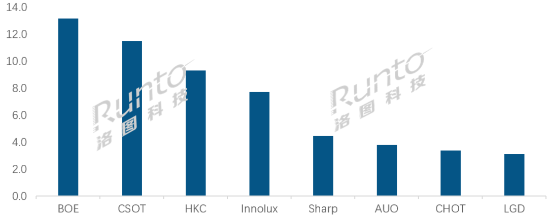 變革后的腰部陣營出現斷檔,腰部廠商集體轉為長尾陣營(年出貨1500萬片左右)。日系廠商Sharp(夏普)在第一季度的出貨量約為440萬片,同環比分別大幅增長59.6%和24.7%,同環比增幅居行業第一,市占率達到7.9%,同比提升2.9個百分點。