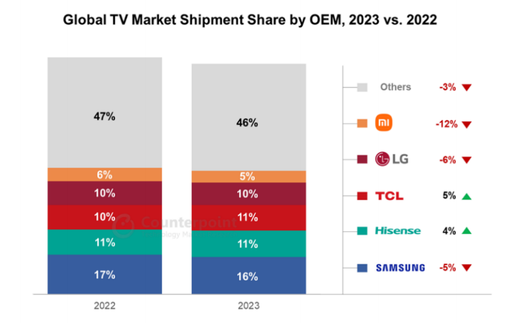 圖:2022-2023 全球 TV 出貨量份額按OEM廠商分