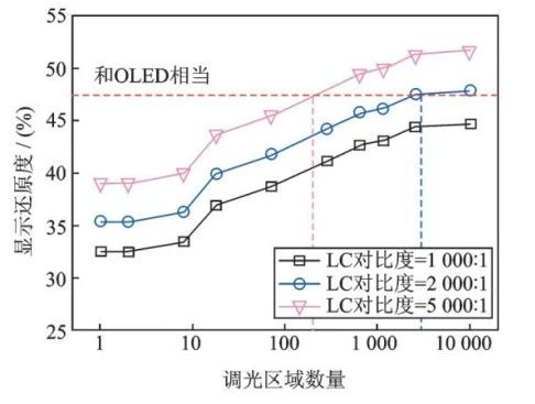 具體而言,OLED技術的高對比度源于其像素級別的調光技術,也就是具有足夠多的調光區域,LCD的對比度由LC層和背光調光設計共同決定。為了達到與OLED相同的表現,當LC層的對比度達到5000:1時,需要200個調光區域;當LC層達到對比度2000:1時,需要3000個調光區域。傳統的LED背光不能分出足夠的可控區域,如果采用Mini-LED背光技術,就可以達到需要的控制精度要求。