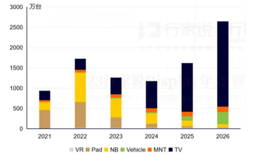 Mini-LED背光與上一代LCD顯示一脈相承,電視為主要增量。LCD經過多年的市場拓展,在電視、電腦等領域應用廣泛,由于Mini-LED背光與LCD背光技術原理一致,可以很好利用LCD的產業鏈和市場渠道推廣。根據行家說《2023Mini-LED背光調研白皮書》中成果,2023年,Mini-LED背光產品整體出貨量約為1259萬臺,Mini-LED背光TV板塊同比增長近50%,預計2024-2026年TV將保持增長,成為Mini-LED背光最主要的拉動力量。