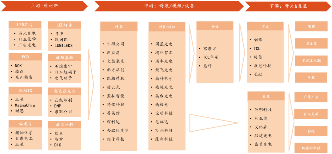 Mini-LED背光和直顯產業鏈相似,上游原材料包括LED芯片、燈珠、PCB、玻璃基板、驅動IC等;Mini-LED直顯使用RGB三色芯片可以作為像素點直接顯示圖像,Mini-LED背光本質是仍是液晶顯示,Mini-LED作為外部光源后通過濾色片顯示顏色,因此在中游環節直顯相比背光省去了背光模組和液晶面板環節;在下游環節,背光目前主要應用在電視、顯示屏等領域,直顯主要應用在戶外廣告、會議大屏等領域。