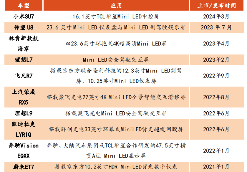 圖:搭載Mini-LED背光車載顯示屏部分車型