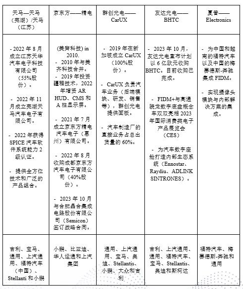 為應(yīng)對(duì)價(jià)格暴跌和利潤(rùn)萎縮,群創(chuàng)光電、夏普、友達(dá)光電和天馬等老牌面板供應(yīng)商自2019年以來(lái)紛紛拓展到一級(jí)業(yè)務(wù),并取得了一些顯著的成功。如2019年,群創(chuàng)光電成立了一家100%控股的子公司CarUX,并將其成功轉(zhuǎn)變?yōu)橐患覔碛卸鄠€(gè)大型綜合顯示面板項(xiàng)目的一級(jí)公司;2023年,友達(dá)光電與BHTC合并,旨在完善智慧出行的業(yè)務(wù)矩陣,并推動(dòng)其朝著智能座艙解決方案提供商的方向轉(zhuǎn)型;2022年,天馬成立了江蘇天華汽車(chē)電子科技有限公司和蕪湖天馬汽車(chē)電子有限公司,以拓展一級(jí)顯示模塊組裝業(yè)務(wù)。