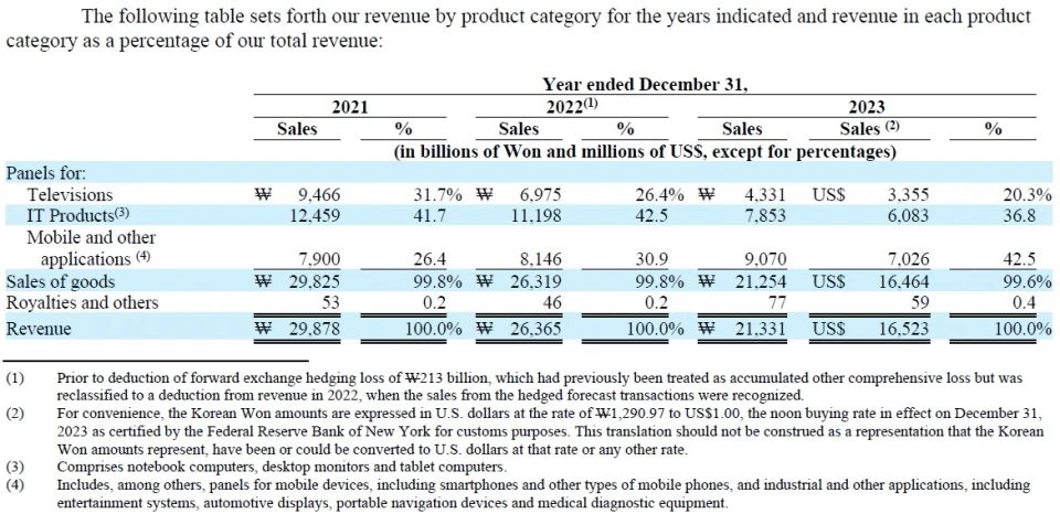 去年,OLED(10.24萬億韓元)占LG Display總銷售額(21.33萬億韓元)的48%。高于2021年的36%和2022年的40%。去年總銷售額中,剩余的11.09萬億韓元(52%)大部分來自LCD。