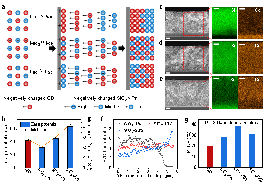 研究人員選用二氧化硅(SiO2)和二氧化鈦(TiO2)納米粒子與量子點(QD)集成,協同納米粒子的間隔作用和散射效應,以解決單一組分QD膜中由于共振能量轉移(FRET)引起的發光效率下降問題。通過精細的表面設計,研究人員利用EPD技術實現了QD、SiO2和TiO2納米粒子的精確共沉積,提高了QD薄膜的發光效率(圖1)。