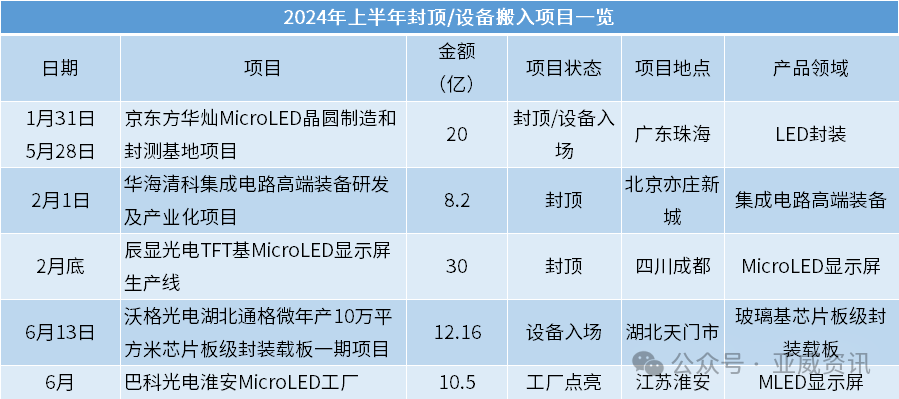 封頂/設備搬入項目共5個,投資金額為80.86億元,其中京東方華燦珠海MicroLED晶圓制造和封裝測試基地是全球首條Micro LED生產線,投資金額約20億。除顯示面板外,還包括設備及材料項目。