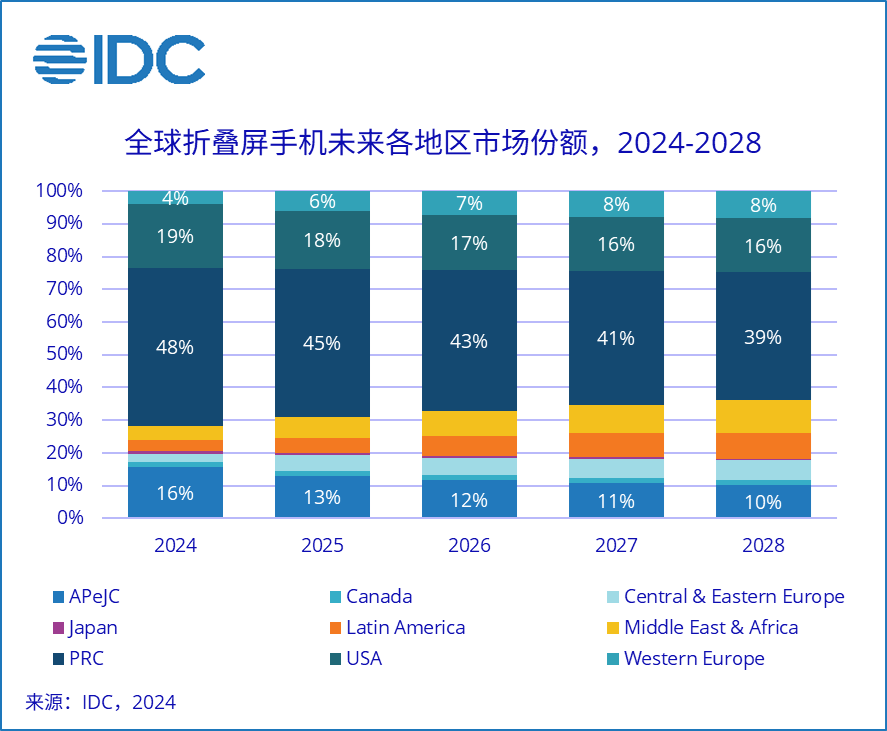 9 月 11 日消息,國際數據公司(IDC)發布的最新手機季度預測報告顯示,預計 2024 年中國折疊屏手機市場出貨量約 1,068 萬臺,同比增長 52.4%;至 2028 年,中國折疊屏手機出貨量將會超過 1,700 萬臺,五年復合增長率達到 19.8%。