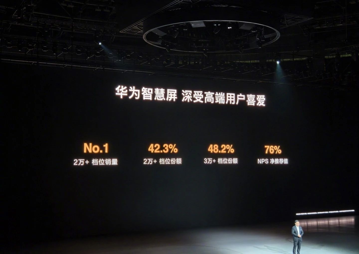 此外,華為常務董事、終端 BG 董事長、智能汽車解決方案 BU 董事長余承東在發布會現場表示,華為智慧屏在 2 萬 + 檔位份額第一,銷量份額 42.3%,3 萬 + 檔位份額 48.2%,NPS 凈推薦值為 76%。