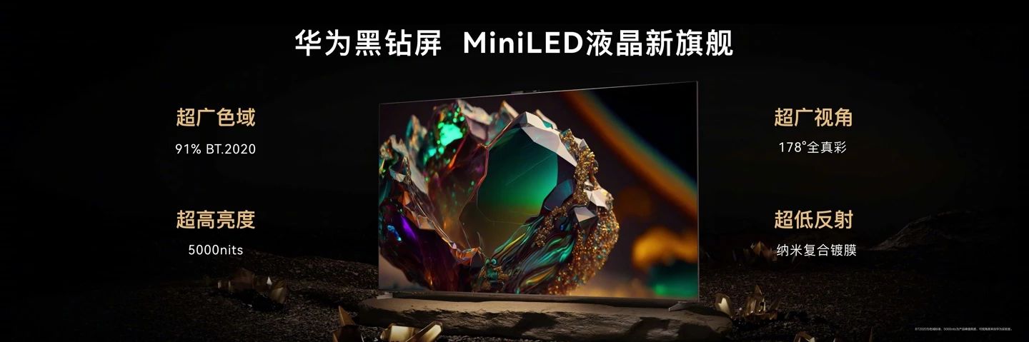 新品配備全新一代 Super Mini LED 黑鉆屏,1.2mm 超窄航空鋁邊框,屏占比達到 99%,擁有 5000nits 峰值亮度和 5040 分區,覆蓋 91% BT2020 色域,8,000,000:1 高對比度、178 度超廣可視角。支持靈犀指向遙控、HUAWEI SOUND 空間音頻,預裝鴻蒙 HarmonyOS 系統。