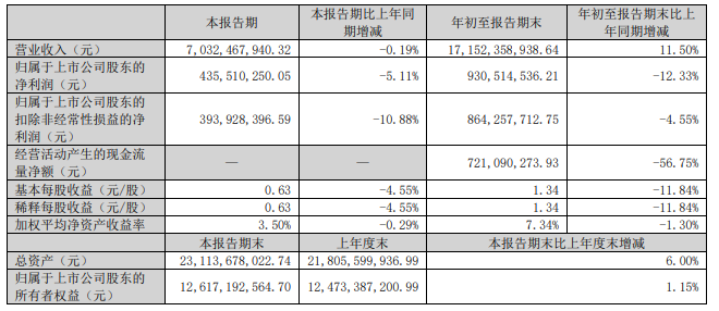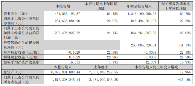 華映科技第三季度營業(yè)收入為4.52億元,同比增長51.75%;歸屬于上市公司股東的凈利潤為-2.85億元,同比減少22.97%;扣除非經(jīng)常性損益后的凈利潤為-2.92億元,同比減少21.74%。經(jīng)營活動(dòng)產(chǎn)生的現(xiàn)金流量凈額為2.6億元,較上年同期增長141.13%。