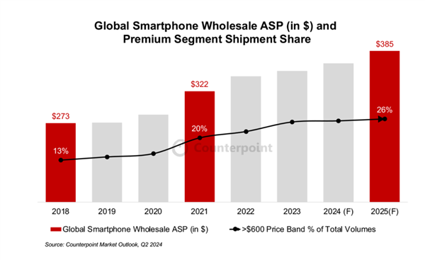 在2024年上半年,定價在1000美元(約合7237元人民幣)及以上的智能手機銷量同比增加了18%。
