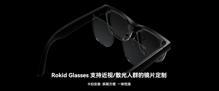 Rokid Glasses 支持近視 / 散光人群定制鏡片,采用卡扣安裝,可以進行方便地拆裝。對于渠道商,Rokid 承諾所有線下渠道商的定制鏡片服務不進行抽成。