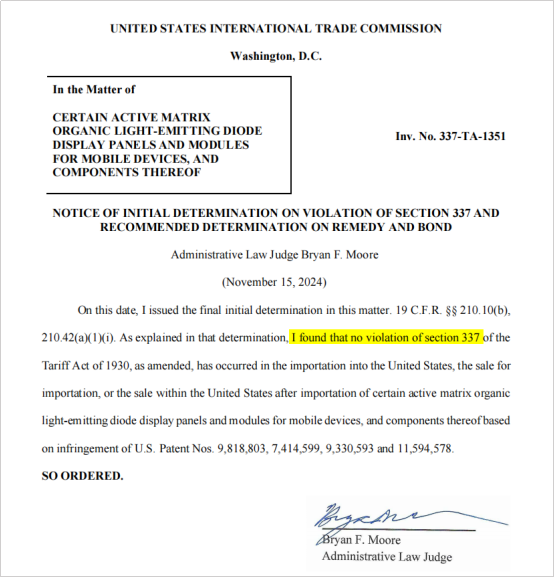 11 月 19 日消息,據(jù) Wit Display 報道,韓國三星顯示有限公司(以下簡稱三星顯示)向美國國際貿(mào)易委員會(ITC)發(fā)起的關(guān)于有機發(fā)光二極管(OLED)專利的 337 調(diào)查迎來了初裁結(jié)果。根據(jù)裁定,ITC 行政法官認定該調(diào)查中未發(fā)現(xiàn)違反《美國 1930 年關(guān)稅法》第 337 條款的行為。